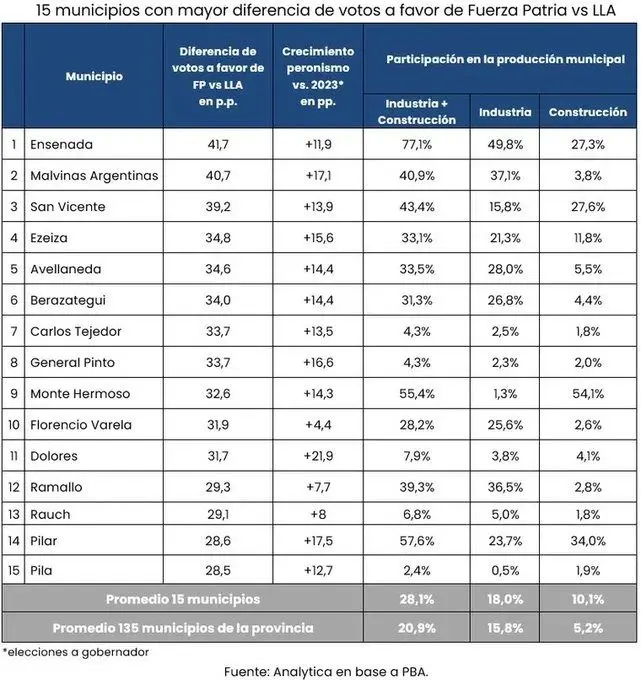 Un estudio realizado por la consultora Analytica de Ricardo Delgado mostró la incidencia de la situación económica en el voto bonaerense. Veríficó cómo en aquellos municipios en los que más cayeron actividades claves en la generación de empleo como la industria y la construcción, mayor fue la diferencia a favor del peronismo. «El impacto de las medidas para ordenar la macro ha sido negativo en el Conurbano», detalló Delgado. Pero la derrota incluyó también localidades del interior bonaerense, muchas vinculadas al sector agropecuario, en las que hacía muchos años que el peronismo no ganaba. Es un dato que podría ayudar a saber si el resultado bonaerense resulta extrapolable a todo el país.
