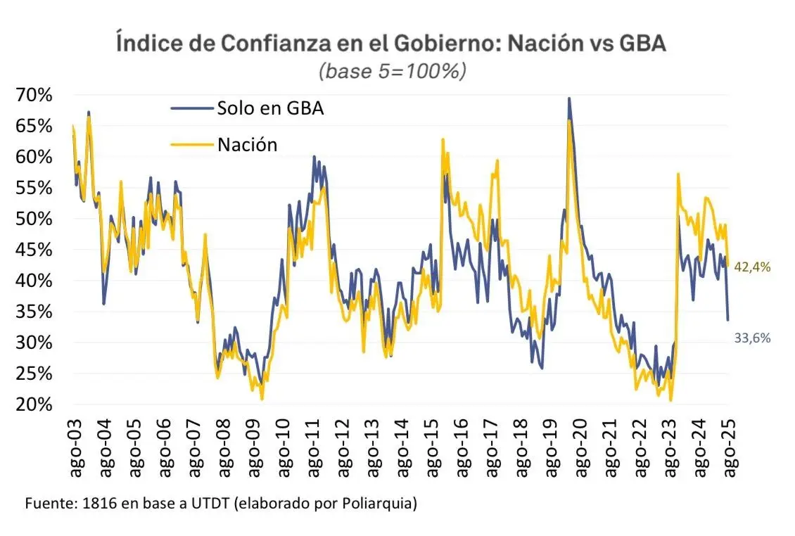 Muchos analistas sostienen que el mejor predictor del humor social continúa siendo el Indice de Confianza en el Gobierno (ICG) que elabora mensualmente la Universidad Di Tella. Un trabajo publicado esta semana por la consultora económica 1816 calculó que la medición del ICG de agosto para el Conurbano dio el equivalente al 33,6%, el porcentaje casi exacto que La Libertad Avanza obtuvo en la Provincia. En todo el país, el ICG de la Di Tella en agosto dio para todo el país un equivalente a 42,4%. Eso indicaría que el respaldo en el interior es superior al del Conurbano. Sin embargo, en el análisis provincia por provincia hay dudas acerca de dónde podría descontar LLA la pérdida en Buenos Aires.