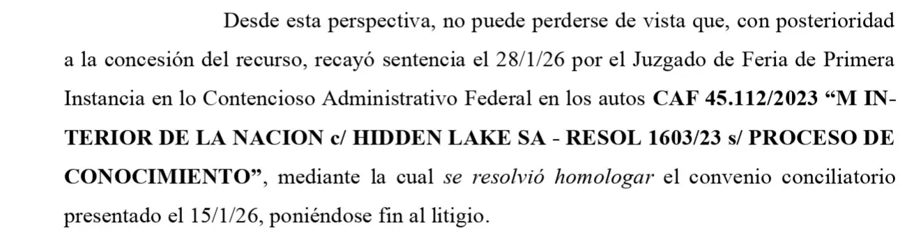 “No puede perderse de vista que, con posterioridad a la concesión del recurso, recayó sentencia el 28 de enero de 2026 por el Juzgado de Feria de Primera Instancia en lo Contencioso Administrativo Federal, en los autos CAF 45.112/2023 – Ministerio del Interior contra Hidden Lake SA”-, mediante la cual se resolvió homologar el convenio conciliatorio presentado el 15 de enero de 2016, poniéndole fin al litigio”, puede leerse en la respuesta de los camaristas Morán y Duffy. El juez que actuó durante la feria fue Walter Lara Correa.