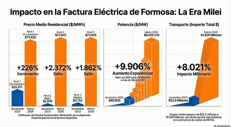 El ajuste se ve en números concretos. En el noreste argentino las tarifas eléctricas escalaron hasta un 2.374% desde noviembre de 2023. En Formosa, los usuarios de ingresos bajos pasaron de pagar $2.976 a $73.625. Los de ingresos medios, de $3.752 a ese mismo valor. Los sectores de mayores ingresos, en cambio, subieron 226%, partiendo de $22.571.