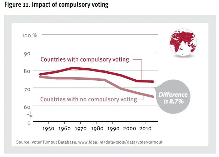 La realidad es que la relación entre la participación y la integridad democrática no es tan clara, porque mientras ternemos países como Vietnam (99.3%), Cuba (97.3%), Nueva Zelanda (86.6%), Italia (88.9%) o Indonesia (89.8%) donde la participación esta normalmente arriba del 85%, en otros como Suiza (48.7%), Colombia (44.1%) o Egipto (41.5%), habitualmente votan menos de la mitad.