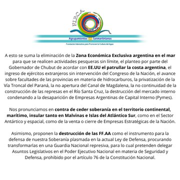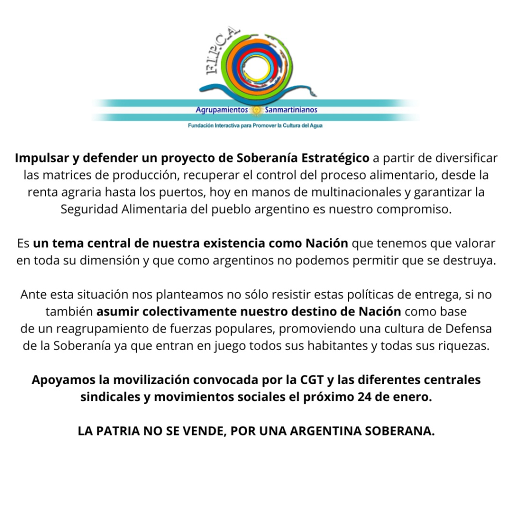 «Tenemos que asumir colectivamente como pueblo nuestro destino de Nación como base de un reagrupamiento de fuerzas populares, promoviendo una cultura de defensa de la soberanía ya que entran en juego todos sus habitantes y todas sus riquezas», completaron.