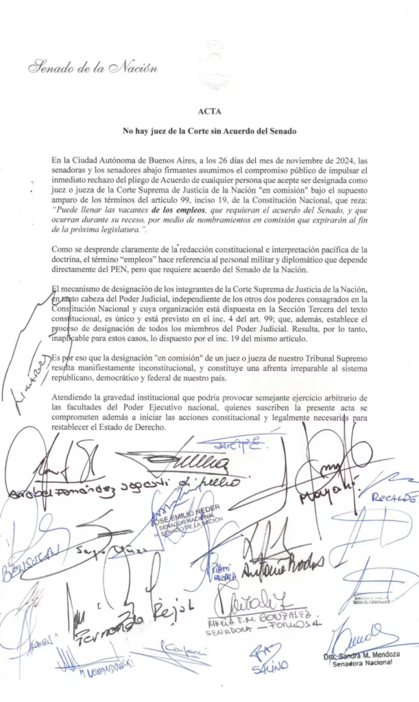 En la Ciudad Autonoma de Buenos Aires, a los 26 dias del mes de noviembre de 2024, las senadoras y los senadores abajo firmantes asumimos el compromiso público de impulsar el inmediato rechazo del pliego de Acuerdo de cualquier persona que acepte ser designada como juez o jueza le la Corte Suprema de Justicia de la Nación “en comisión” bajo el supuesto amparo de los términos del articulo 99, inciso 19, de la Constitución Nacional, que reza: “Puede llenar las vacantes de los empleos, que requieran el acuerdo del Senado, y que ocurran durante su receso, por medio de nombramientos en comisión que expirarán al fin de la próxima legislatura.