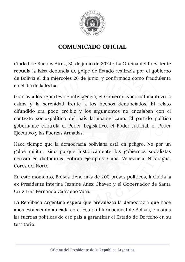 La Oficina de la Presidencia emitió ayer un comunicado en el que acusa al presidente Luis Arce de montar un intento de golpe de Estado al indicar que «repudia la falsa denuncia de golpe de Estado realizada por el gobierno de Bolivia». Además, el gobierno de Milei calificó de «presos políticos» a la ex presidenta de facto Jeanine Áñez Chávez, a la que menciona en el comunicado como «interina», y al gobernador de Santa Cruz Luis Fernando Camacho Vaca; ambos detenidos por el golpe de Estado de noviembre de 2019.