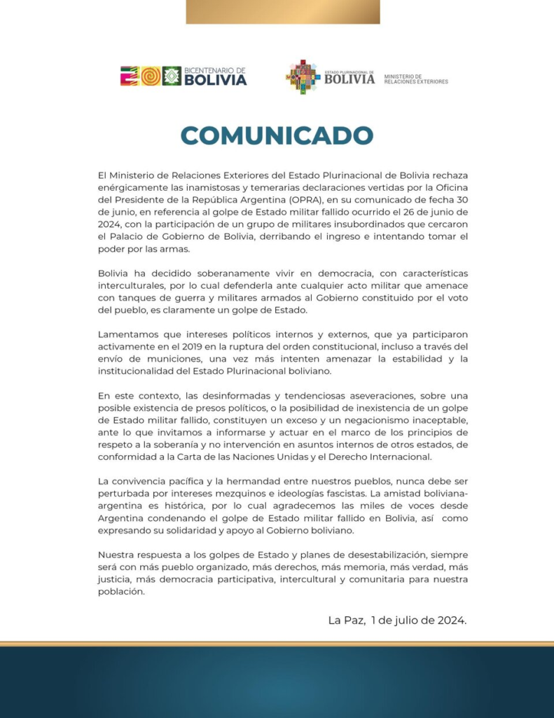 El Ministerio de Relaciones Exteriores boliviano repudió por «inamistosas y temerarias» las expresiones de Milei, quien desestimó el intento de golpe de Estado ocurrido la semana pasada. «La hermandad entre nuestros pueblos nunca debe ser perturbada por intereses mezquinos e ideologías fascistas», dice el comunicado de Bolivia.