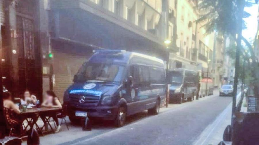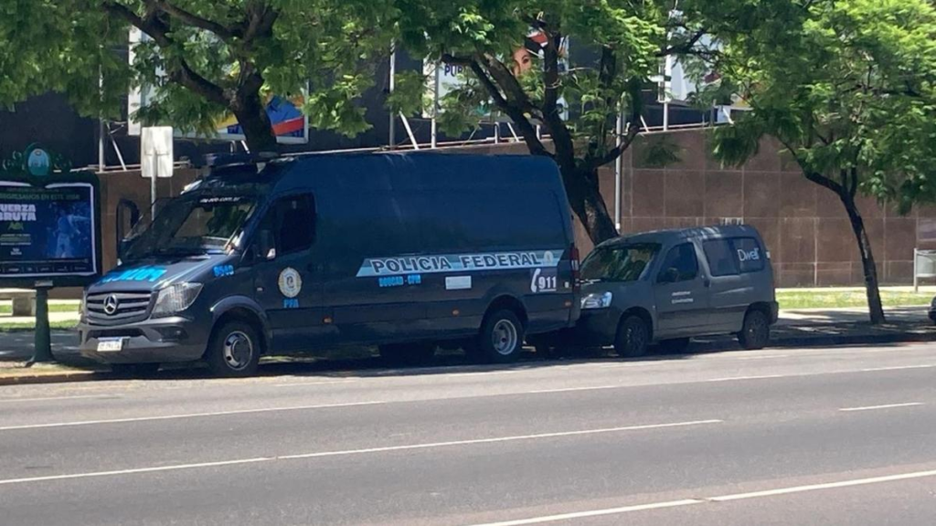 Cerca de las 20, un camión tipo celular de la Policía Federal y unas cinco motos permanecían detenidos a dos metros de la puerta de entrada al edificio de la agencia.