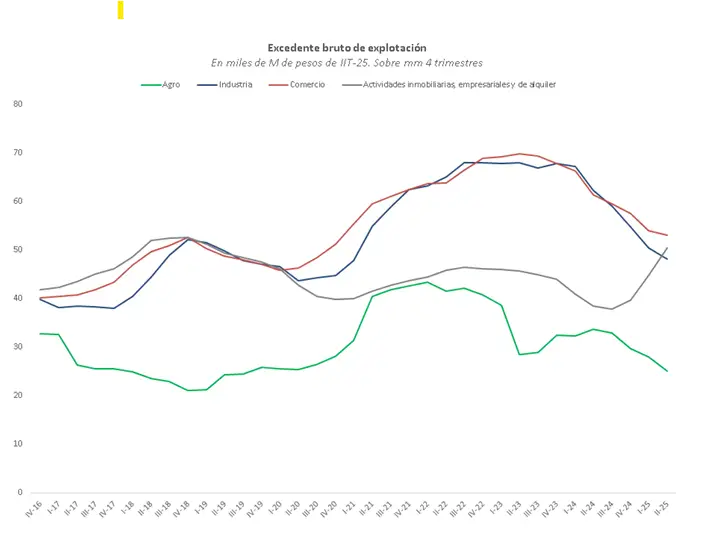 En el caso del comercio, la pérdida fue de 24% contra el pico registrado en el segundo trimestre de 2023. En el caso de la industria, la caída fue del 30%. El agro, por su parte, está 42% por debajo del pico de 2022 y continúa deteriorándose pese a la recomposición luego de la sequía.