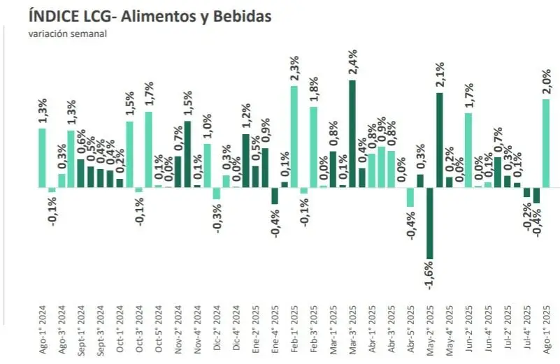 En la primera semana de agosto los alimentos y bebidas relevados presentaron un sensible aumento de precios: 2% semanal, según la consultora lcg.