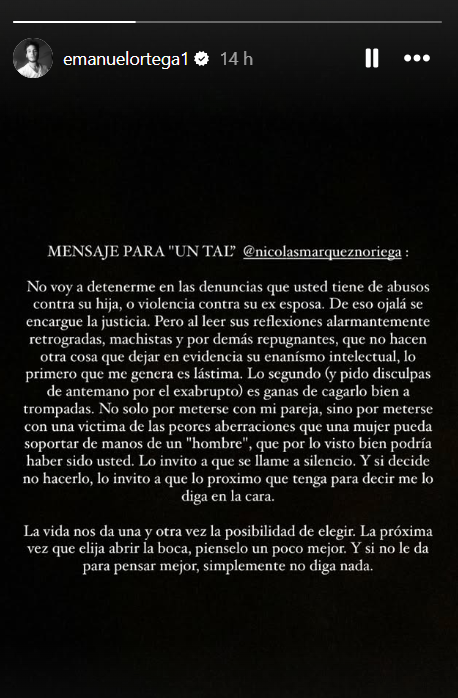 Ortega, al leer el mensaje, no dejó pasar el ataque. En una historia de Instagram, el músico fue tajante. “No voy a detenerme en las denuncias que usted tiene de abusos contra su hija o violencia contra su exesposa. De eso ojalá se encargue la Justicia», empezó su mensaje y calificó las reflexiones del ultraconservador como propias de un «enanismo intelectual». «Al leer sus reflexiones retrógradas, machistas y repugnantes, lo primero que me genera es lástima”, destacó el artista.