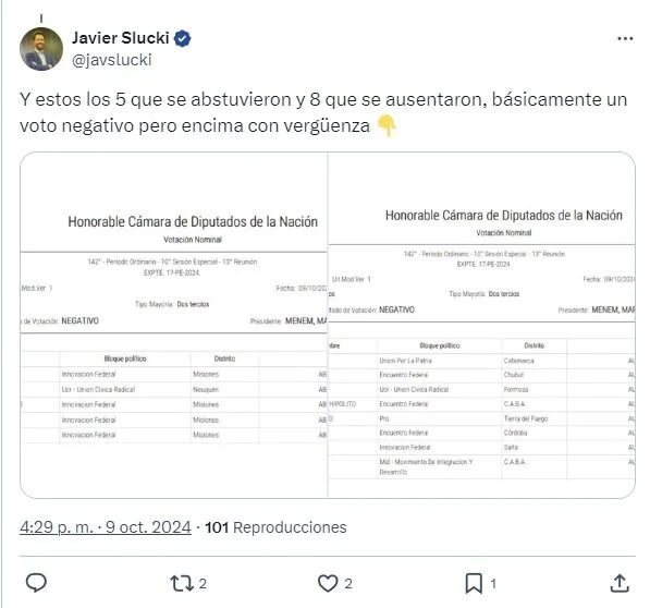Los bloques que apoyaron la postura oficialista fueron el PRO y Creo, además de tres diputados radicales y tres tucumanos de Independencia, que responde al gobernador de Tucumán, Osvaldo Jaldo. Ante la ratificación del veto al presupuesto universitario, el Frente Sindical de Universidades Nacionales convocó a un paro total este jueves 10 de octubre. Tal como pasó con el fallido aumento a los jubilados, el Gobierno logró sobreponer su voluntad a un proyecto sancionado bajo mayoría en ambas cámaras.