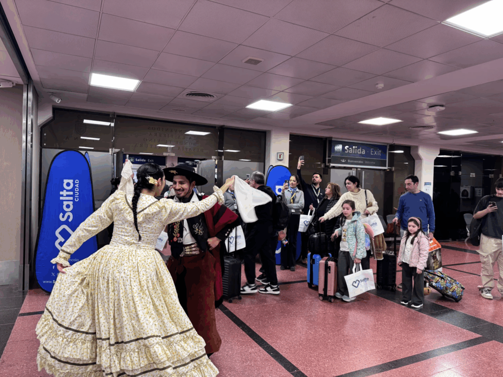 Con la presencia del Ballet Balderrama y la Banda Municipal, la Municipalidad dio la bienvenida a visitantes de Córdoba, Neuquén y Mendoza en el aeropuerto Martín Miguel de Güemes.