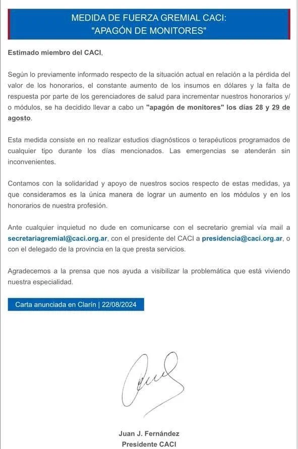 En este sentido, según detallaron desde el CACI, la combinación entre los “honorarios profesionales prácticamente inexistentes por el deterioro inflacionario y el aumento exponencial de los costos para realizar la práctica médica” se traduce en una creciente demora en la entrega de insumos por parte de obras sociales y prepagas, lo que expone a los pacientes a riesgos de mortalidad. Según apuntaron, “con sus prácticas cada año, en la Argentina se salvan 200.000 vidas aproximadamente”.