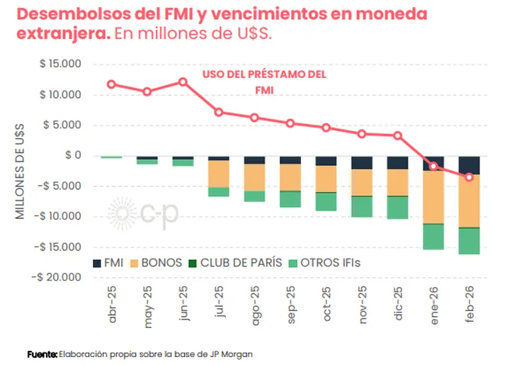En los próximos nueve meses vencen u$s16.000 millones entre la deuda con organismos, títulos soberanos con bonistas privados y bopreales. En ese sentido, C-P advirtió que los recursos del FMI solo alcanzarían para saldar los pagos hasta enero de 2026, aún suponiendo que el FMI perdona el incumplimiento de las metas y aprueba todos los desembolsos.