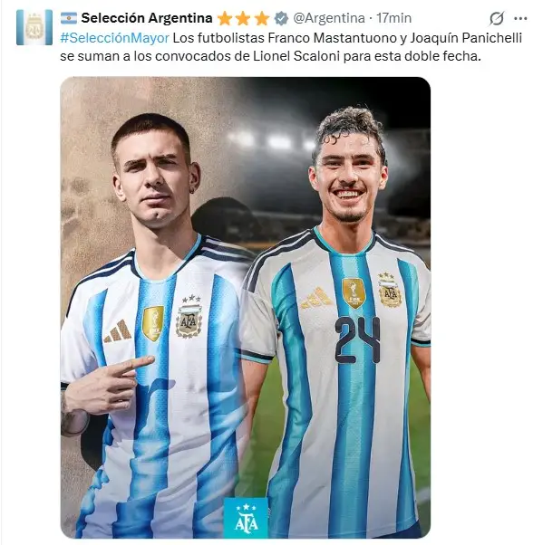 El anuncio de las citaciones de Mastantuono y Panichelli se realizó a través de la cuenta oficial de la red social X de la Selección. «Los futbolistas Franco Mastantuono y Joaquín Panichelli se suman a los convocados de Lionel Scaloni para esta doble fecha», se lee en la publicación de este viernes del seleccionado nacional.