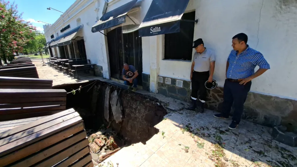 Luego del fuerte temporal del viernes, la vereda del pasaje Miramar, donde se encuentra un reconocido local gastronómico, sufrió daños severos, tal es así que se produjo el hundimiento de la misma.