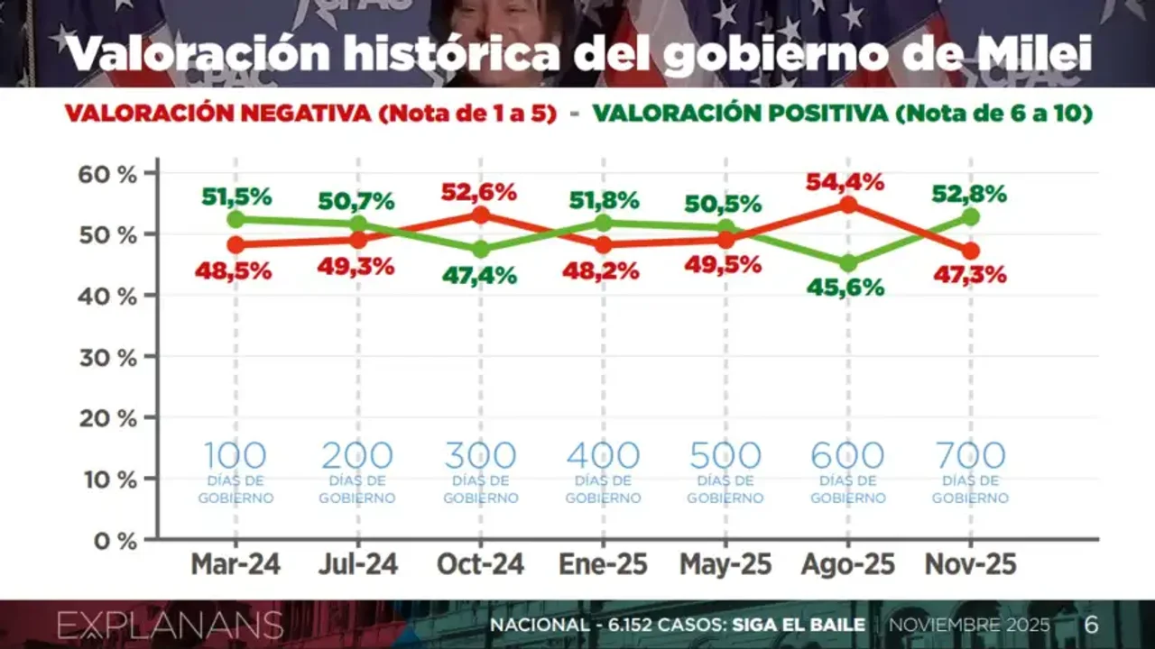 En este relevo nacional, en el que 6.152 personas puntuaron a Milei y su gobierno, entre el 5 y el 11 de noviembre, el oficialismo llegó a su pico histórico, que no tiene nada de holgado: llegó a un promedio de 5,4 puntos.
