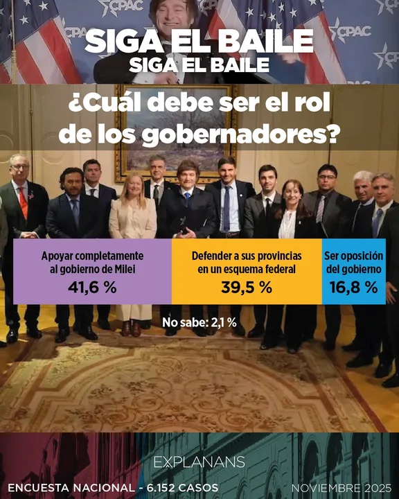 “Las elecciones también reconfiguraron el tablero federal. Al preguntar por el rol de los gobernadores frente al gobierno nacional, un 41 % sostiene que deben apoyar completamente a la Casa Rosada, mientras el 39 % prioriza la defensa de sus provincias”.