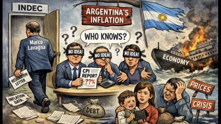 Un barco en llamas con la palabra «Economy», economistas con los ojos vendados frente a un informe de inflación lleno de signos de pregunta, Marco Lavagna que abandona el Indec y una familia muerta de hambre, mirando la escena con angustia. La cruda caricatura fue publicada por Steve Hanke, el padre de la dolarización que prometió Milei y no cumplió.