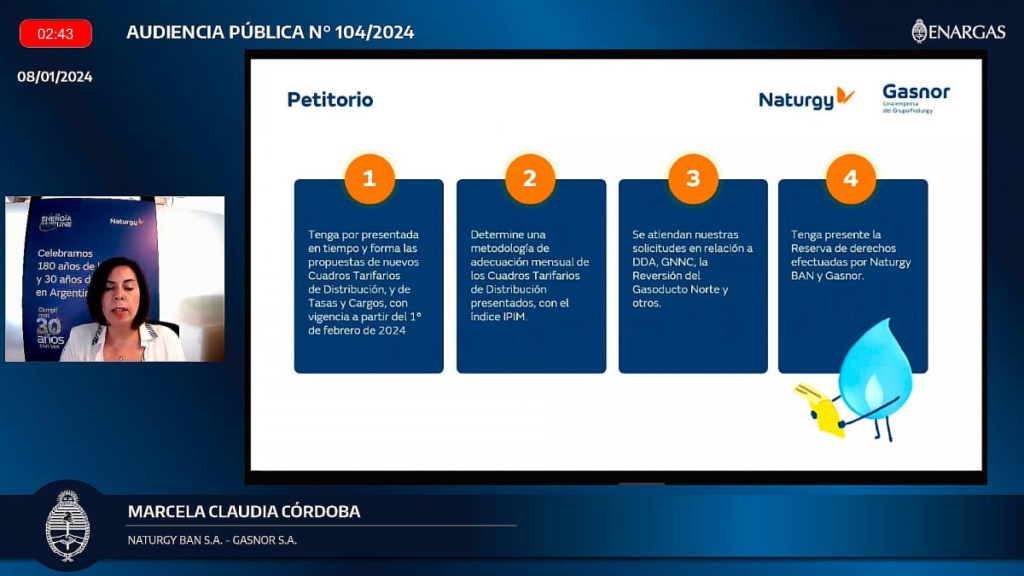 Marcela Córdoba, en representación de Naturgy BAN y Gasnor, propuso un incremento del 413%, aunque advirtió que la distribución representa el 16% de la tarifa total para la primera empresa y del 19% para la segunda, lo que implica una incidencia del 66,1% y 78,5%, respectivamente.