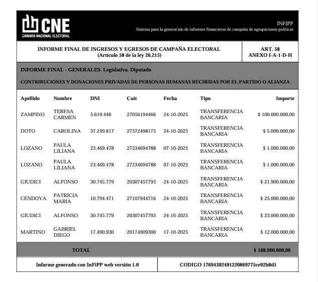 Los aportes a LLA fueron predominantemente de empresas (más de 806 millones). Zampino es una de las escasas seis personas que le pusieron nombre y apellido a sus «donaciones», que englobaron más de 188 millones. Buena parte del resto de ese monto lo completa otra familia, los Giudici-Cendoya.