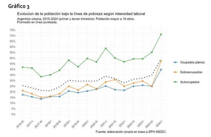 Al profundizar sobre el impacto de la pobreza, se observa que en los diferentes segmentos económicos creció jerárquicamente, aunque entre los sectores más vulnerables, de trabajadores no calificados y manuales, superó el 65%. En estas clases, para 2024, la pobreza afecta a casi 7 de cada 10 personas.