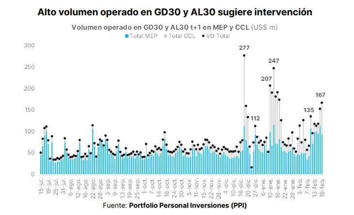 “Luego de la irrupción del ‘criptogate’, se registró un fuerte salto en el volumen operado de GD30 y AL30 en D y C (MEP y CCL, respectivamente) que sugiere intervención del BCRA. En las últimas dos ruedas fue u$s152 millones y u$s167 millones”, sostuvo Portfolio Personal Inversiones (PPI) en un reporte enviado a sus clientes.