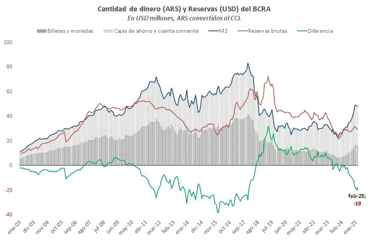 Respecto del primer punto, señaló que, entre junio de 2024 y febrero de 2025, los pesos en circulación sumados al stock en cajas de ahorro y cuentas corrientes privadas crecieron 55% medidos al CCL. En contraste, las reservas brutas cayeron 1,5%. “Así, hay más pesos líquidos que podrían presionar sobre el dólar que reservas para responder”, plantearon los analistas del Bapro.