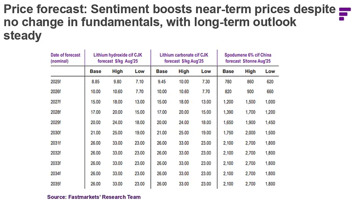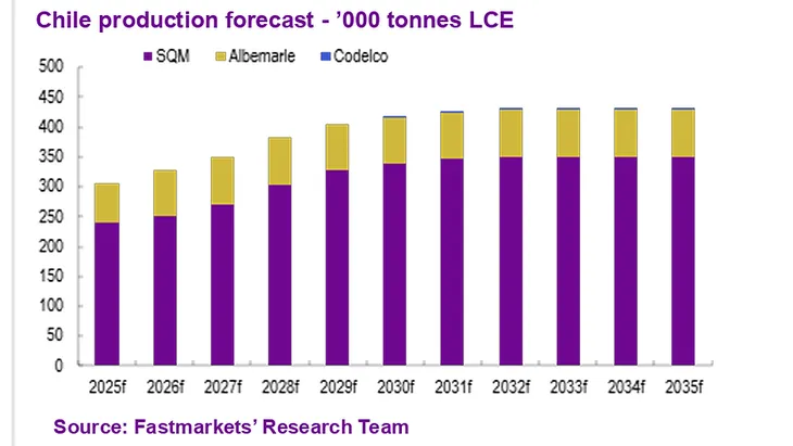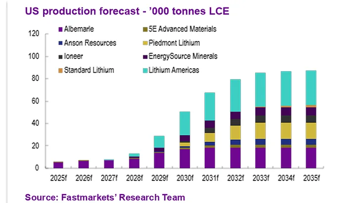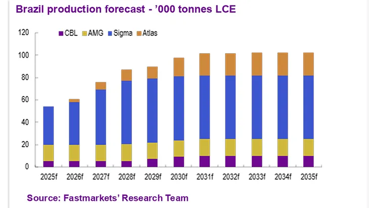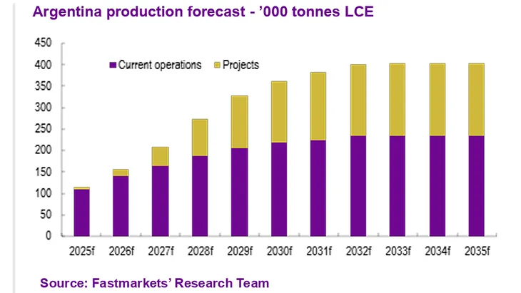 Fastmarkets elevó su previsión de crecimiento compuesto anual (CAGR) de 12% a 14% para el período 2025–2035, impulsada por los nuevos desarrollos en marcha. Entre los proyectos más destacados figuran Sal de Oro (POSCO, fase 2), Hombre Muerto Oeste de Galan Lithium, y la expansión de Fénix (Rio Tinto Lithium).