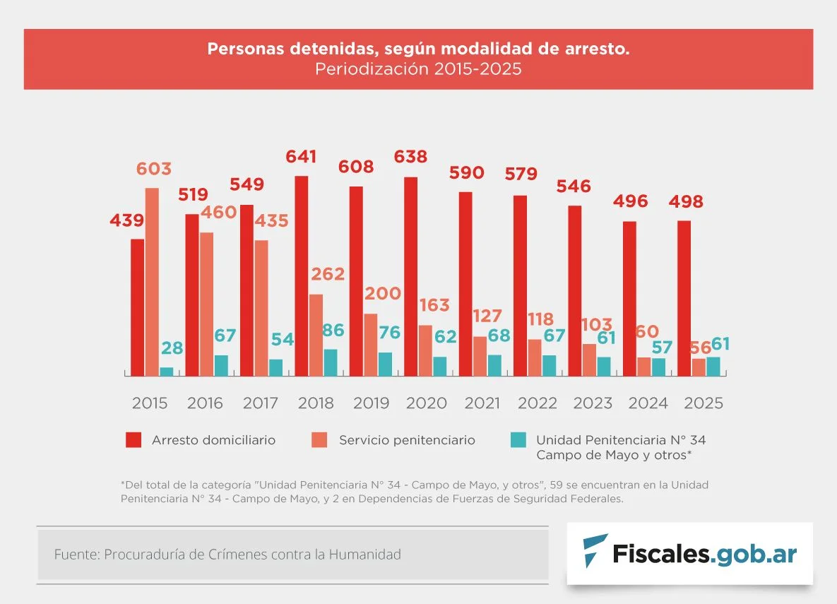 «Suman 502 las personas imputadas por crímenes de lesa humanidad y, a la fecha de cierre de los datos, 27 fueron indagadas y esperan la resolución de su situación procesal. En la fase de instrucción hay actualmente 401 personas procesadas, fueron sobreseídas 118 y otras 158 cuentan con falta de mérito«, continuó el informe, y concluyó: «En relación con la situación de las personas imputadas, 615 se encuentran detenidas, 1.489 están libres y 33 están prófugas. La estadística sobre la evolución anual de estas variables refleja que a partir de 2016 la cifra de las personas en libertad empieza a superar —y se aleja año a año— a la de las personas sujetas a una medida de coerción. De las 615 personas privadas de su libertad, 498 gozan del beneficio del arresto domiciliario, 61 transitan su detención en unidades penitenciarias y otras 56 se encuentran alojadas en la Unidad Penitenciaria N°34 del Servicio Penitenciario Federal, situada en el interior de la guarnición militar de Campo de Mayo.