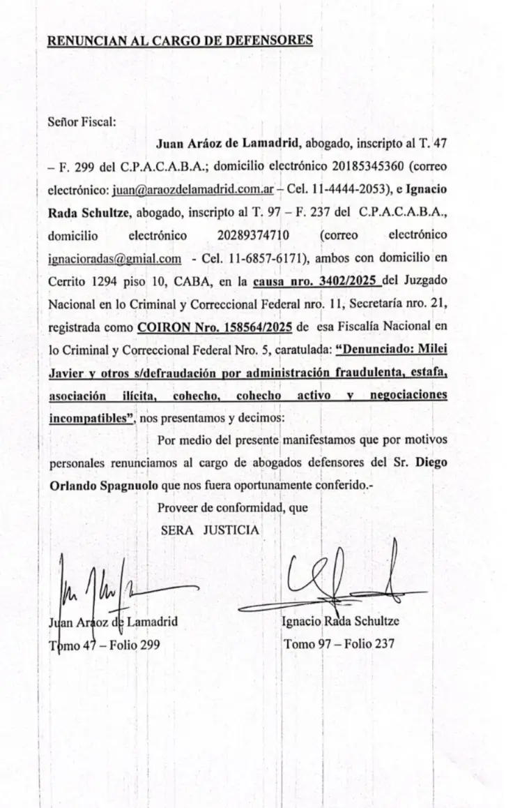 Se encendieron las alarmas en Casa Rosada y en el entorno de los hermanos Milei: los abogados de Diego Spagnuolo, ex titular de la Agencia Nacional De Discapacidad (ANDIS), renunciaron este viernes a la defensa del ex funcionario implicado en el pago de coimas para la compra de medicamentos. «Por medio del presente manifestamos que por motivos personales renunciamos al cargo de abogados defensores del Sr. Diego Orlando Spagnuolo que nos fuera oportunamente conferido», expresaron.
