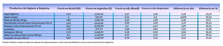 El caso del desodorante corporal en aerosol de la misma marca que se comercializa en ambos países, tampoco deja de sorprender, dado que en Argentina es 81,16% más caro en dólares, seguida por la pasta de dientes (que cuesta 69,9% más), el detergente (58,24%) y el papel higiénico (52,19%), todos productos de primera necesidad para el cuidado de la salud y la higiene.