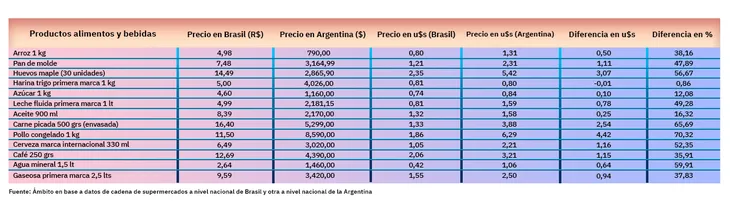 En este sentido, Ámbito realizó un relevamiento de 22 productos de la canasta en el que comparó precios de una cadena de supermercados de Brasil (presente en más de cinco estados) con uno de la Argentina (con presencia en casi todo el país).