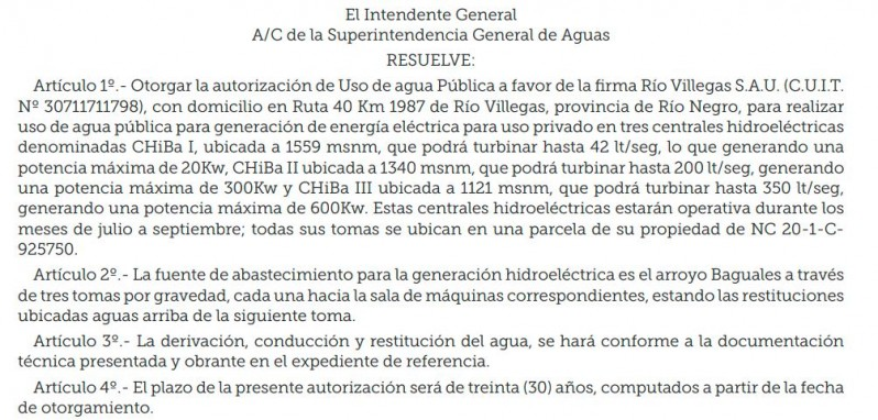 Según consta en el Boletín Oficial N° 6357 del 23 de enero de 2025, específicamente en la página 21, el gobierno de Alberto Weretilneck otorgó a la firma Río Villegas S.A.U. el permiso para el uso de agua pública con fines de generación eléctrica privada. Allí se detalla que la empresa podrá operar tres centrales -denominadas CHiBa I, II y III- dentro de una parcela de su propiedad, utilizando caudales específicos del arroyo Baguales para abastecer un emprendimiento propio.
