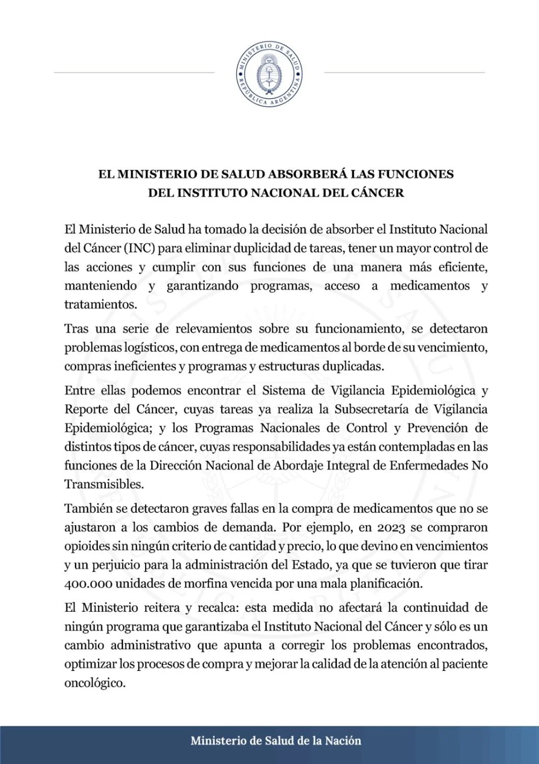 «El Ministerio de Salud ha tomado la decisión de absorber el Instituto Nacional del Cáncer (INC) para eliminar duplicidad de tareas, tener un mayor control de las acciones y cumplir con sus funciones de una manera más eficiente, manteniendo y garantizando programas, acceso a medicamentos y tratamientos», indicó el Ministerio de Salud en un comunicado.